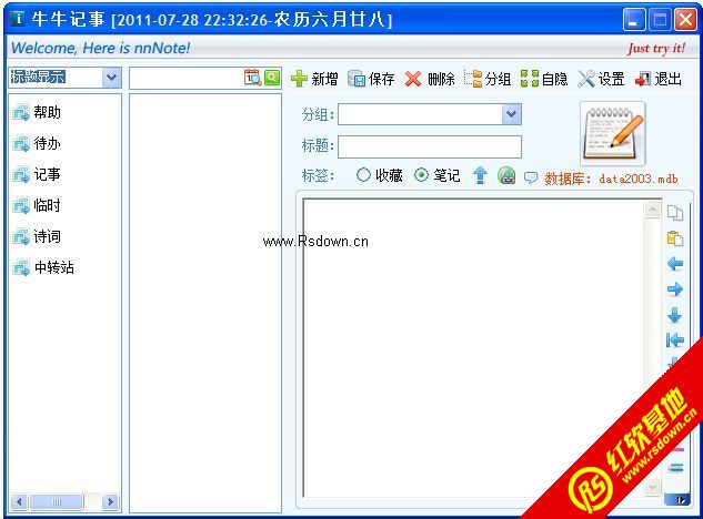 牛牛记事是一个简单的记事程序,支持图片保存,可设置自动保存,可以像QQ那样隐藏,操作比较简单,适用于一般记事;牛牛记事没有密码机制,因此不适合记录保密的信息,考虑到Access数据库的安全问题,设置密码也没有多大作用,于是干脆取消了密码登录。现在先上传程序,关于程序的详细用法和技巧,以后更新